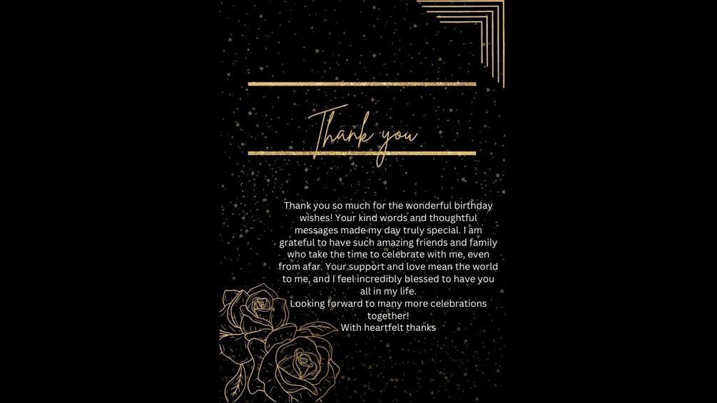 Message: "Thank you so much for the wonderful birthday wishes! Your kind words and thoughtful messages made my day truly special. I am grateful to have such amazing friends and family who take the time to celebrate with me, even from afar. Your support and love mean the world to me, and I feel incredibly blessed to have you all in my life. Looking forward to many more celebrations together! With heartfelt thanks."